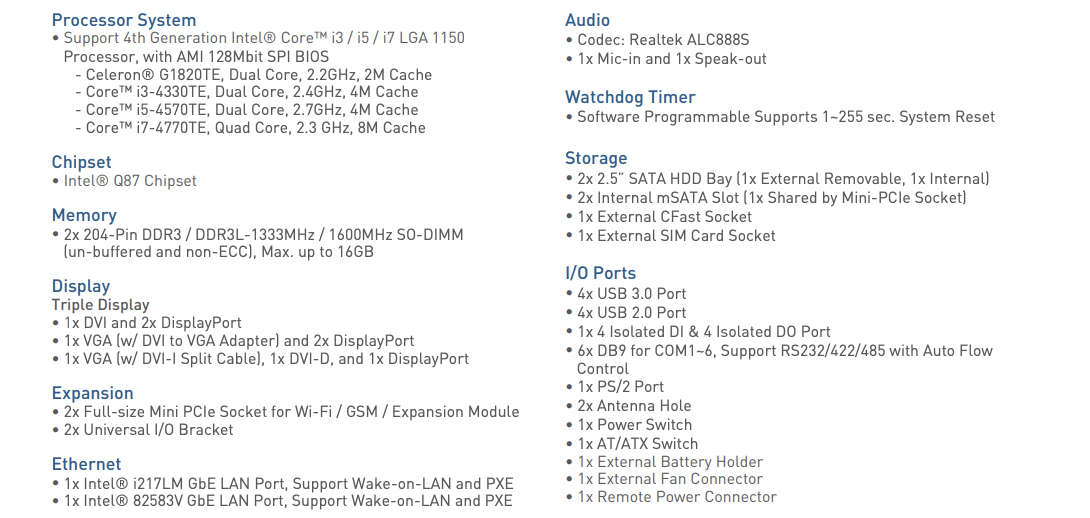 • 2x Mini-PCIe Slot for Wi-Fi GSM or I/O Expansion