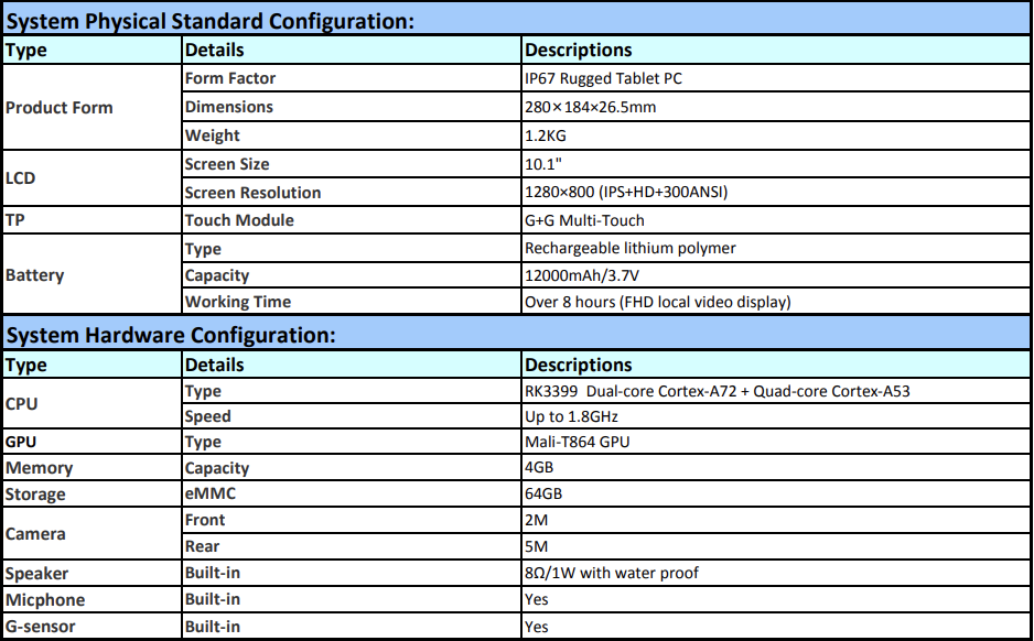 Key Features IP67, 10.1″ IPS + RK3399 + 4G +64G + WiFi   2.4G&5G Dual band + 1000Mbps + HDMI1.4 + RS-232(DB9)+ USB3.0