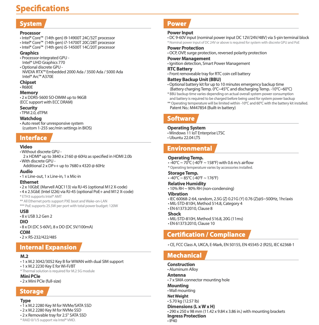 Intel 9th Gen Core i7/ Intel 8th Gen Core i7/i5/i3 CPU w/ 6 x RJ45 GbE (opt. 4 x PoE max. 100W)/ 4 x COM/ 1 x DP/ 1 x HDMI/ 1 x DVI-I/ 4 x USB 3.0/ 9-48V Edge AI GPU Computing