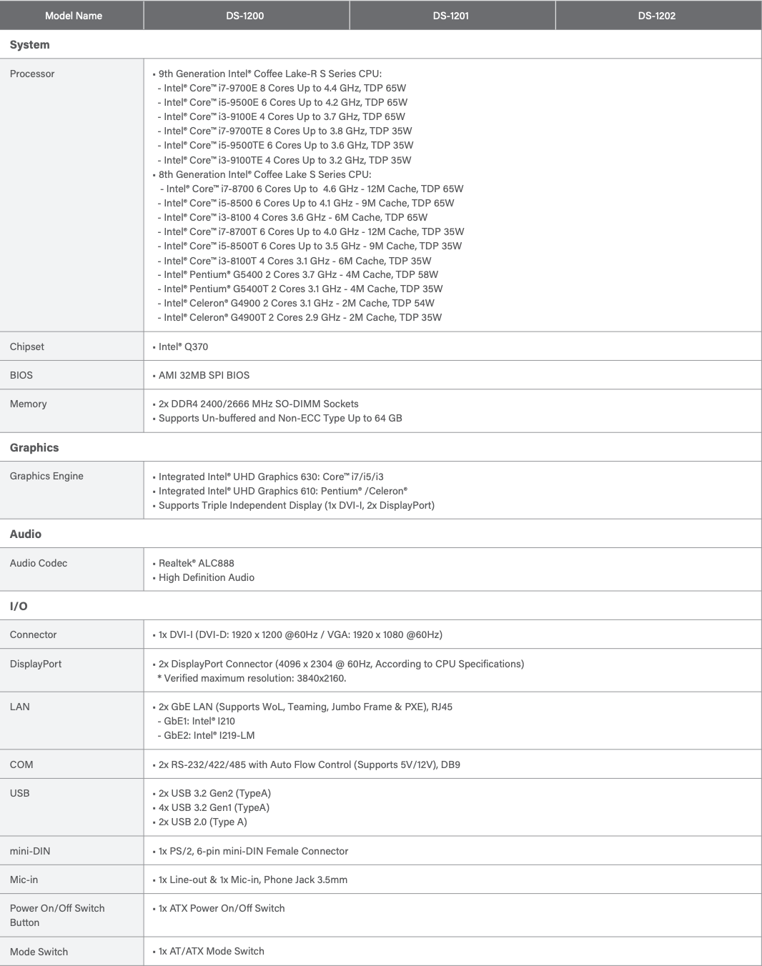 DS-1200 Series is a high performance fanless embedded computer, powered by 9/8th Generation Intel® Core™ processor (Coee Lake) with up to 8 cores and 64GB DDR4 memory capacity for unprecedented performance to fulfill all kinds of high-end computing requirements.